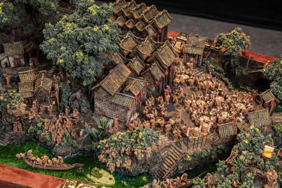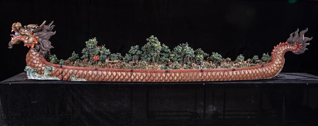 龙舟陶塑总长度441cm,宽度78cm,高度81cm。承载着龙眼古村和803个人物构成的村史故事,获“含最多人物的龙舟陶塑”大世界基尼斯纪录。作品由中国国家访问学者、正高级工艺美术师、广东省陶瓷艺术大师王榕茂创作,带领团队制作,历时2年半时间完成。创作源于融合顺德龙眼村近千年村史文化,以“龙舟”作为主体,承载着古龙眼村的概貌。龙舟主体用粗陶塑造,草木灰、胎釉设色。龙舟上承载“龙渚古村”景观和人文故事,采用捏塑、堆积贴塑,表现丰富多彩的内容。作品形、釉、色含蓄高雅,呈现出文化和工艺的默契融合。表现出千年老龙的自然形态和威严,凝结千年古村时空之美,承载着悠久的民俗记忆。重塑龙眼古村历史上繁荣鼎盛景象。